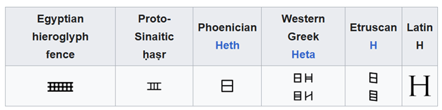 Bokstaven H har sin opprinnelse i det fønikiske alfabetet, der tegnet heth betegnet en halssammentrekning som moderne språkbrukere normalt bare produserer ufrivillig i møte med kald luft eller dårlig kaffe. Grekerne videreutviklet tegnet til eta, før romerne standardiserte formen i det latinske alfabetet, som ligger til grunn for dagens norske skrift.