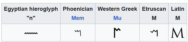 Eller vi kan bruke denne illustrasjonen fra Wikipedia om bokstaven Ms historie: