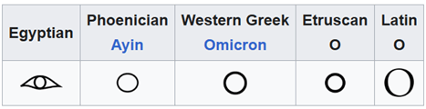 Bokstaven O (o) er den femtende bokstav i det latinske alfabet og har sin opprinnelse i det fønikiske tegn ʿayin, som i sin tid betegnet øyet. Dette tegn ble overtatt av grekerne som omicron, hvorved dets opprinnelige betydning ble løsrevet fra sin billedlige referanse og i stedet knyttet til en ren vokallyd. Gjennom romernes adopsjon av det greske alfabet fikk bokstaven sin nåværende form og funksjon, preget av enkelhet, lukkethet og sirkulær fullstendighet. Se illustrasjonen fra wikipedia: